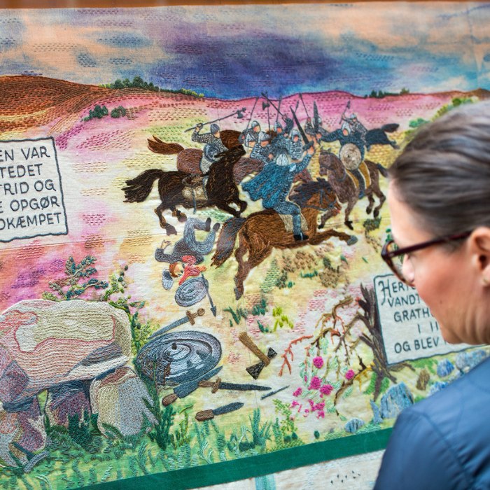 Tag med Viborg Guiderne på besøg i Søndermarkskirken, hvor det berømte Hærvejstæppe hænger.